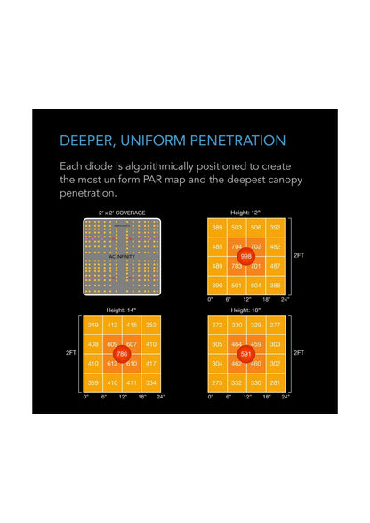 - Algorithmisch positionierte Dioden sorgen für die gleichmäßigste PAR-Karte und die tiefste Durchdringung des Blätterdachs.