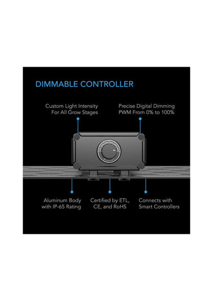 - Der Dimmer ermöglicht eine Helligkeit von 0 bis 100 %. Kann mit unseren Smart-Controllern verbunden werden, um auf Wachstumszyklen, Zeitplanung und App zuzugreifen.