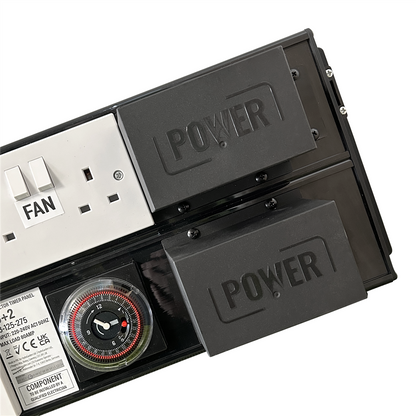 The 16+2 Contactor Timer Panel enables scheduled operation of heavy load appliance without danger of timer contact burnout. As an electrical component, it must be installed by a qualified electrician or other competent professional to ensure compliance with relevant local regulations. Up to 16 appliances, with a combined total load of 80 amps, may be plugged into the panel and scheduled synchronously over a 24-hour period. The timer has 96 fifteen-minute on/off segments, and can be set to “timed”, “continuously on” or “continuously off”. A further 2 power outlet sockets, marked “FAN”, are not timed, and have a continuous power supply.