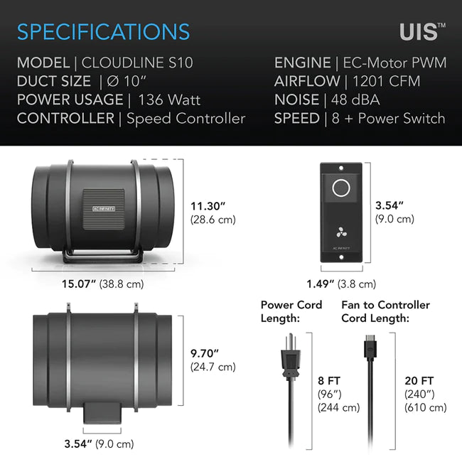 The AC Infinity Cloudline EC Fan is a premium inline ventilation fan engineered for ultra-quiet and energy-efficient airflow in hydroponic grow rooms, tents, and climate-controlled cultivation setups. Using advanced EC motor technology, it provides precise speed control, silent operation, and compatibility with AC Infinity smart controllers for automated climate regulation. Ideal for intake or extraction, the Cloudline fan stabilizes temperature, humidity, and CO₂ levels—ensuring optimal root zone conditions and enhancing nutrient uptake. The mixed-flow design ensures strong static pressure performance, even with carbon filters and long duct runs. Designed for stealth and professional use, this fan comes with a digital speed controller, mounting hardware, and a detachable power cord. It’s perfect for growers using automated irrigation and looking for seamless integration with advanced environmental systems. Key Features: EC motor for silent, energy-efficient operation Smart controller-compatible for precise climate control Ideal for intake/extraction in hydroponic grow rooms Stabilizes airflow and root zone temperature Includes digital controller and mounting kit Mixed-flow design for strong airflow under pressure Compatible with carbon filters, silencers, and ducting Works in automated irrigation and smart grow environments
