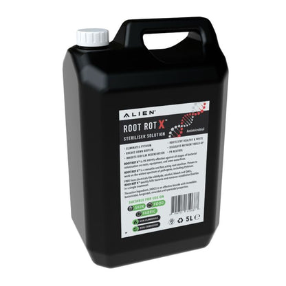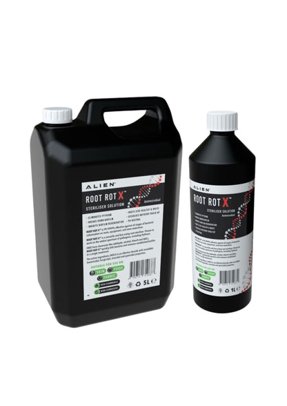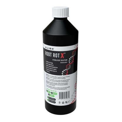 Alien Root Rot X is a powerful root zone treatment specially formulated for hydroponic and recirculating systems. It helps prevent and control root rot, pythium, and bacterial infections, keeping your water lines, tanks, and root zones clean and protected. By actively disinfecting your nutrient solution and grow system, it promotes stronger roots, better nutrient uptake, and overall plant health.