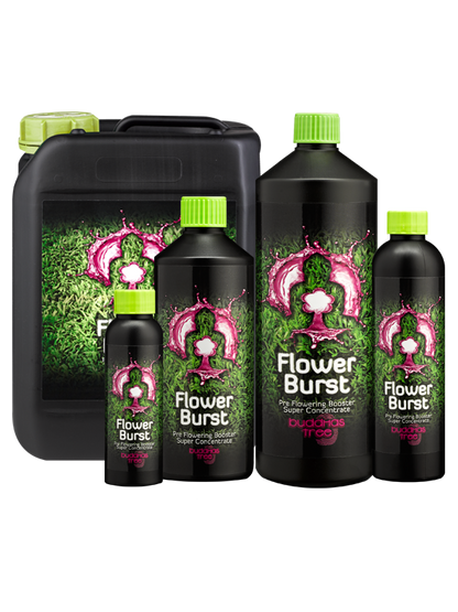 Flower Burst Buddha's Tree is a specialised bloom-phase additive formulated to initiate rapid bud development and transition plants smoothly from vegetative to flowering stages. Designed for use in hydroponic systems, coco, and soil, it delivers precise levels of phosphorus and boron to jumpstart early flower production and support internal energy transfer. Flower Burst improves nutrient delivery during one of the most crucial stages of the grow cycle—setting the foundation for larger yields and more uniform bud sites. It also enhances root zone performance by encouraging strong uptake of essential bloom-phase elements. This early bloom booster integrates seamlessly into your existing feeding regimen and is compatible with both hand-fed and automated irrigation setups. Key Features: Stimulates early bud and flower formation Contains phosphorus and boron for cell development Optimizes nutrient delivery during bloom transition Strengthens root zone activity and uptake efficiency Suitable for hydro, coco, and soil-based systems Ideal for use in the first 2 weeks of flowering Clean and concentrated for easy mixing Compatible with automated irrigation systems