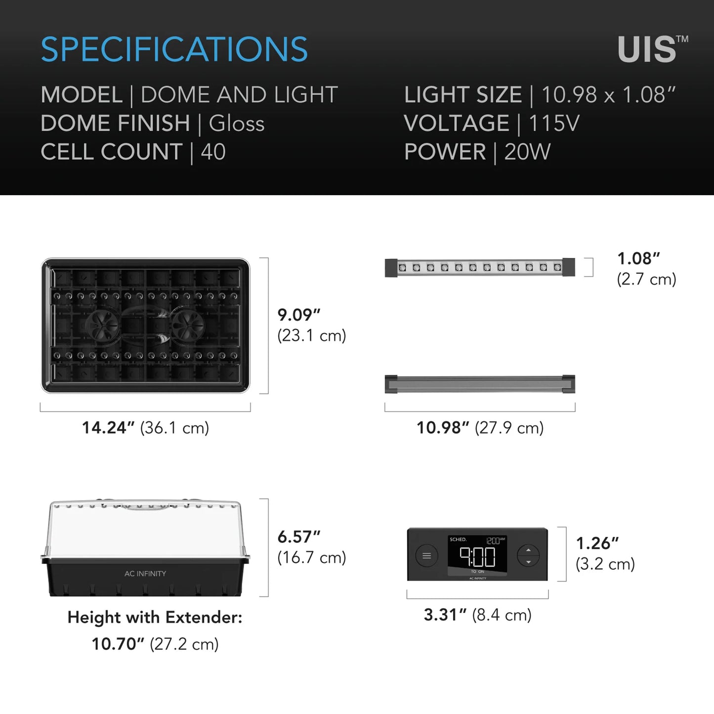 AC Infinity Humidity Dome Germination Kit with LED Lights, 5X8 Cell Tray offers everything you need for successful seedling propagation. The humidity dome ensures optimal moisture levels, while the included LED grow light bars provide the perfect spectrum for healthy plant growth. The 5X8 cell tray allows for efficient space utilization, perfect for starting a variety of seeds. Ideal for indoor gardeners, it creates a controlled environment for seed germination and early plant development.