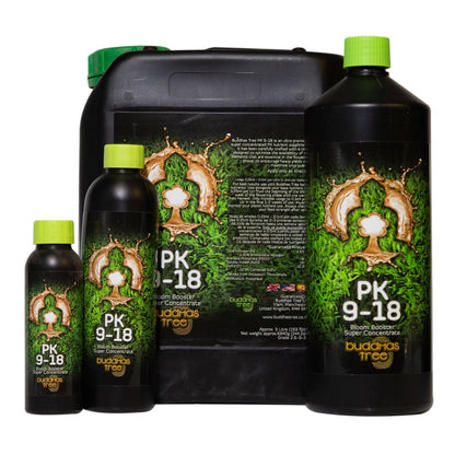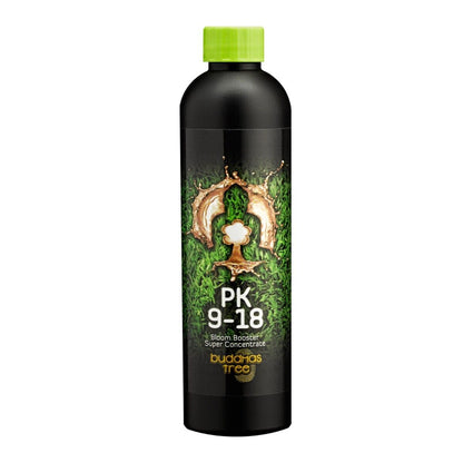 PK 9-18 Buddha's Tree is a premium phosphorus and potassium bloom booster designed to drive explosive flower production and increased density during the peak of the flowering stage. Formulated specifically for use in hydroponic systems, soil, and coco, this high-performance additive works alongside your base nutrients to enhance size, aroma, and yield potential. Delivering a powerful 9-18 PK ratio, it supports essential processes like sugar conversion, energy transfer, and cell division, helping plants push toward their full genetic potential. PK 9-18 also strengthens the root zone during high-demand phases, ensuring consistent nutrient delivery and uptake. Ideal for both hobby and commercial growers, it integrates easily into hand-fed or automated irrigation systems for clean and effective application. Key Features: High-strength PK additive (9-18) for heavy flowering Promotes dense buds, resin production, and final weight Boosts nutrient delivery and metabolic efficiency Supports strong root zone function in late bloom Suitable for hydro, coco, and soil-based grows Works with all base nutrient programs Easy to use in automated irrigation or hand-fed systems Used during peak bloom for maximum yield potential