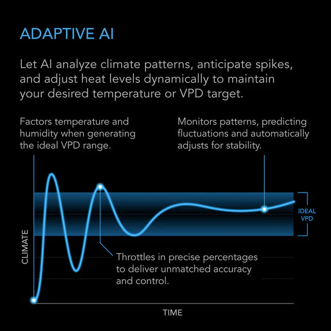 Using intelligent algorithms, the THERMOFORGE T7 continuously monitors environmental conditions and dynamically adjusts its output in real time to maintain your programmed settings. This ensures consistent temperature stability and optimal transpiration rates, helping to improve plant health, growth speed, and overall yields.